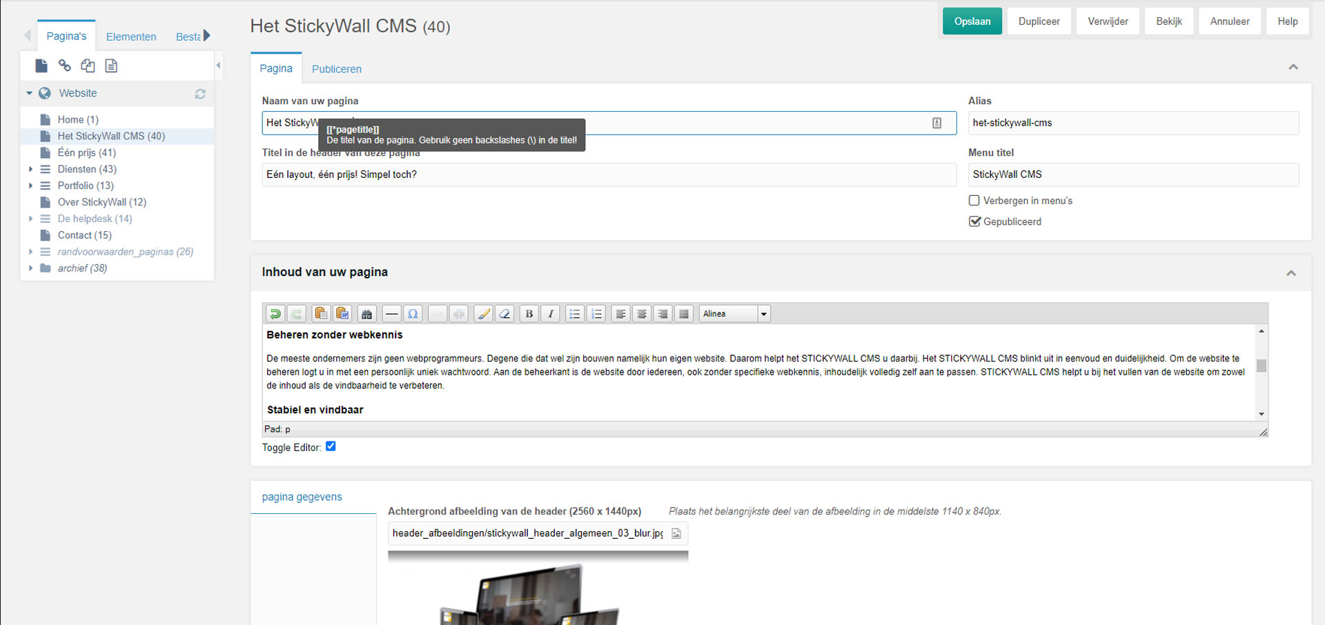 De meeste ondernemers zijn geen webprogrammeurs. Degene die dat wel zijn bouwen namelijk hun eigen website. Daarom helpt het STICKYWALL CMS u daarbij. Het STICKYWALL CMS blinkt uit in eenvoud en duidelijkheid. Om de website te beheren logt u in met een persoonlijk uniek wachtwoord. Aan de beheerkant is de website door iedereen, ook zonder specifieke webkennis, inhoudelijk volledig zelf aan te passen. STICKYWALL CMS helpt u bij het vullen van de website om zowel de inhoud als de vindbaarheid te verbeteren.