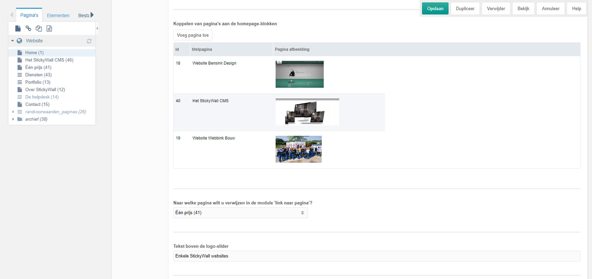 De homepage is als het ware de voorpagina van de website, net zoals bij een krant. Daar komt de klant vaak bij u binnen, daar vind hij of zij direct al de belangrijkste informatie in het kort, met de mogelijkheid om vervolgens elders op de website meer informatie te vinden. Welke onderwerpen dat zijn, bepaalt u zelf. Het STICKYWALL CMS zorgt voor de vorm, u voor de inhoud!